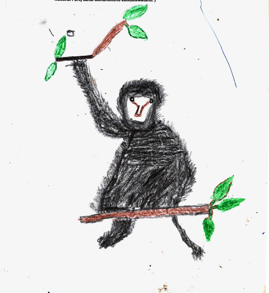 In the younger age group the winner was Kaborkole Joyce. The judge liked ".. her bold use of space, line, shape and color. He liked that in drawing a monkey " she also departs from the obvious Chimpanzee Kibale National Park is known for, to show us a new gem."