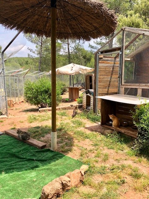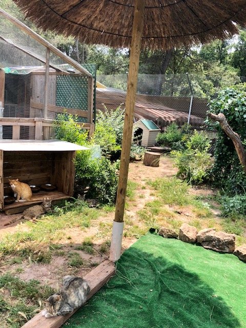 La casa tiene un patio al aire libre donde los gatos pueden disfrutar del sol y está equipado con una sofá, varias camas y rascadores.