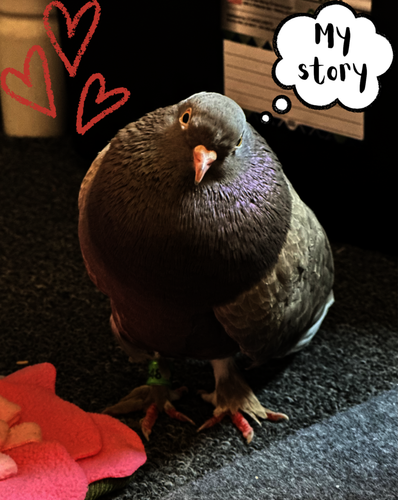 When a bird is well on the way to recovery, they tend to get salty and sassy, and we welcome that fighting spirit. But Hazelnut, though spirited, has been nothing but sugar -- she just LOVES people! And she isn't a one-person bird, either -- she has bonded to her whole foster family! Hazelnut embodies the friendliness, scrappiness, and optimism that we celebrate in pigeons.