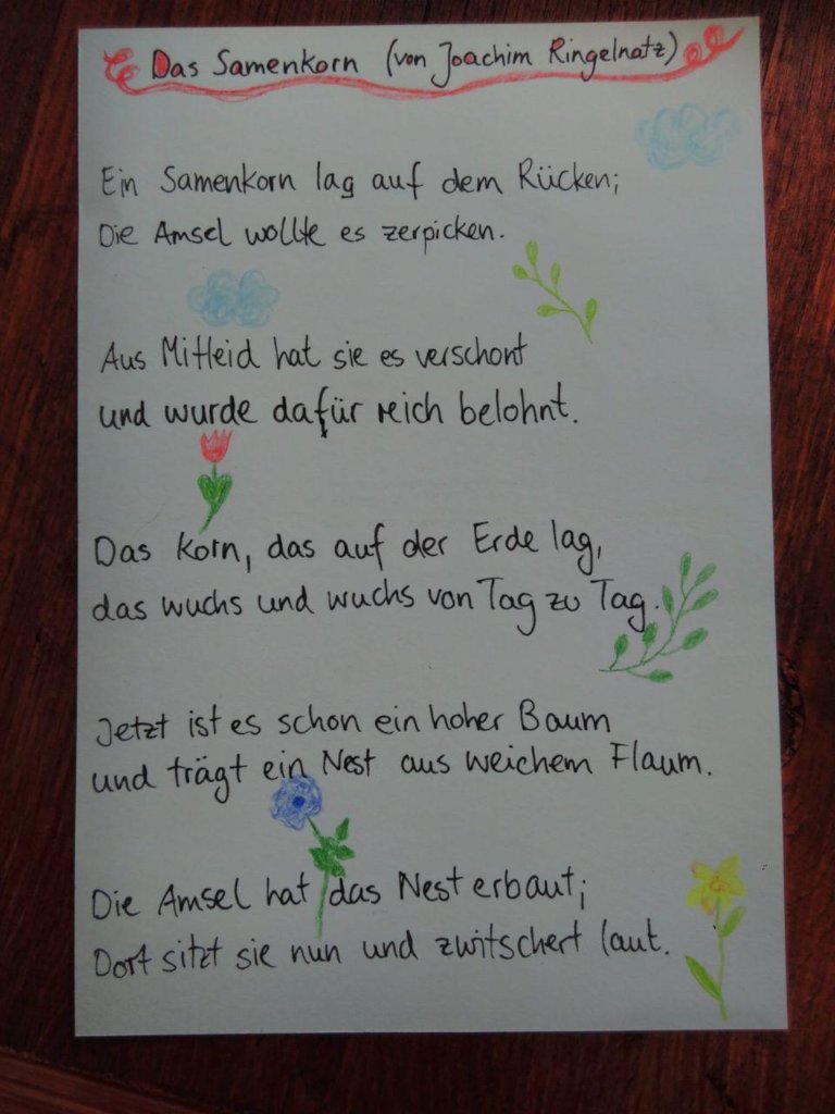 We also wanted to offer our tandems a way of staying in contact other than trough internet and phone. So we bought plain and stamped postcards and send them, with a little personal note for everyone, to our mentors and mentees. Each of them got 3 postcards to send one every week. They could create every postcard individually. We received some photos and could see some creative, lovely painted pictures, poems, Easter bunnies and greetings. We also want to share some postcards with you.