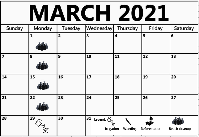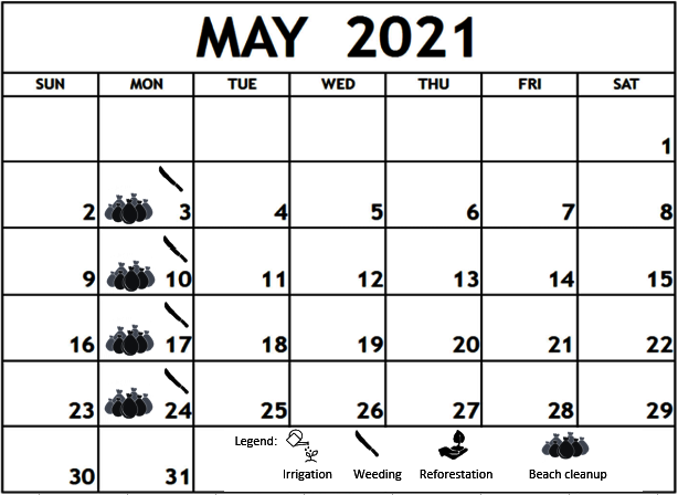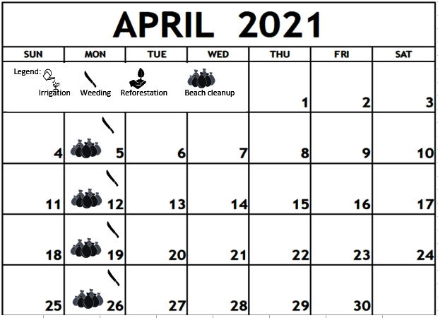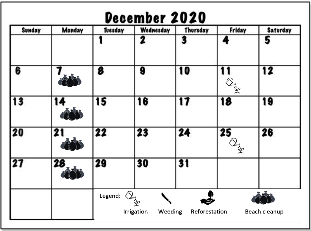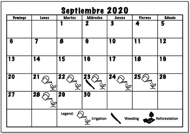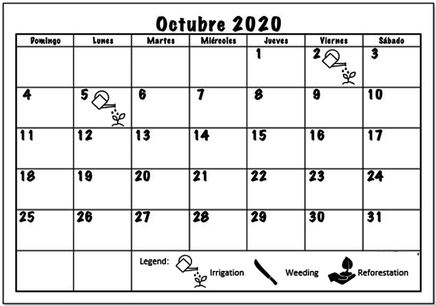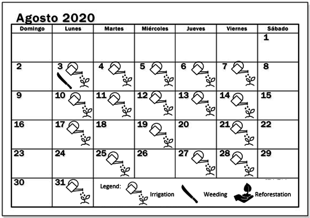 The attached images include the work shedule by month showing irrigation, weeding, reforestation and cleanup days for this reporting period.