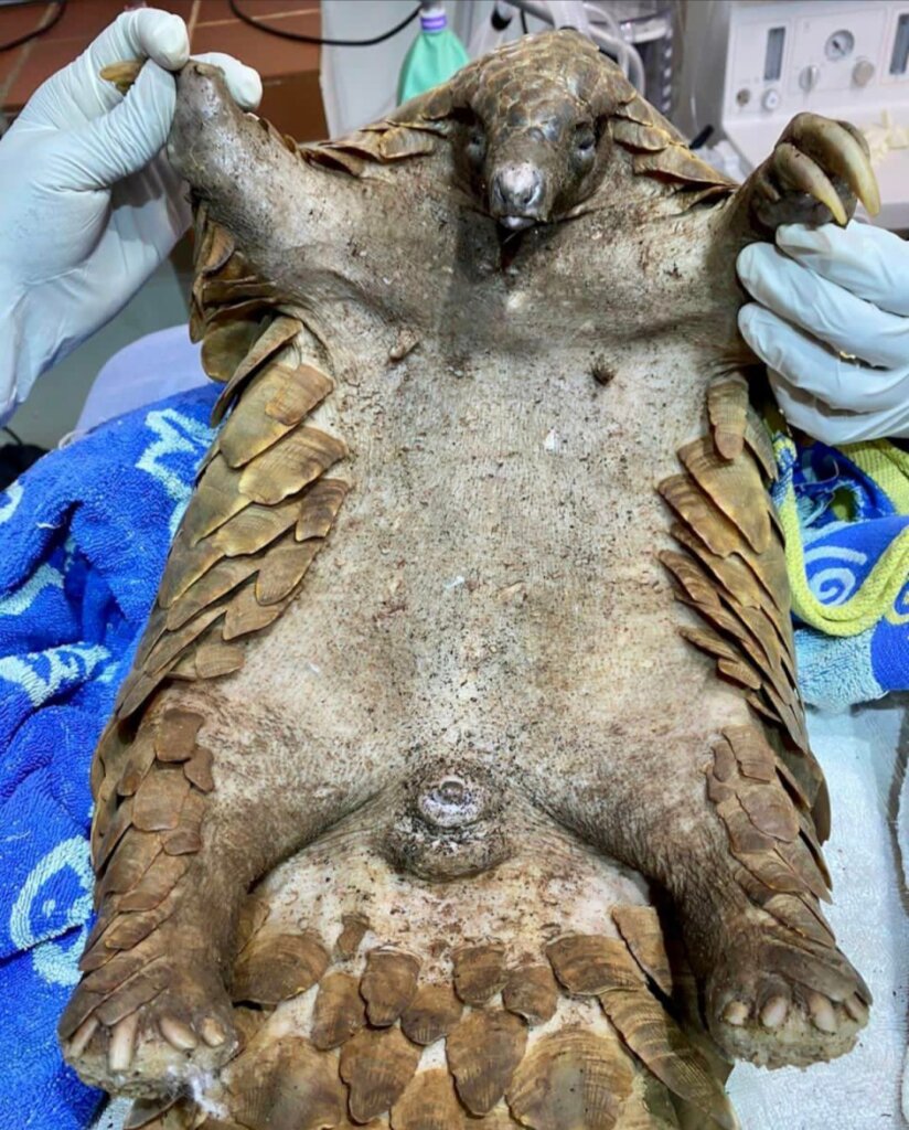 Confiscated pangolin receiving a vet check