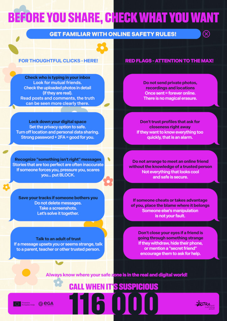 The research shows that online communication was the key recruitment tool, used to establish or maintain contact in every case. Grooming typically began with attention, compliments, and emotional support, gradually evolving into manipulation, control, and exploitation. In the majority of cases, exploitation was sexual, sometimes combined with forced criminal activity, labor exploitation, or forced marriage. Digital tools were frequently used for surveillance, threats, blackmail, and control over victims’ movements and communication.