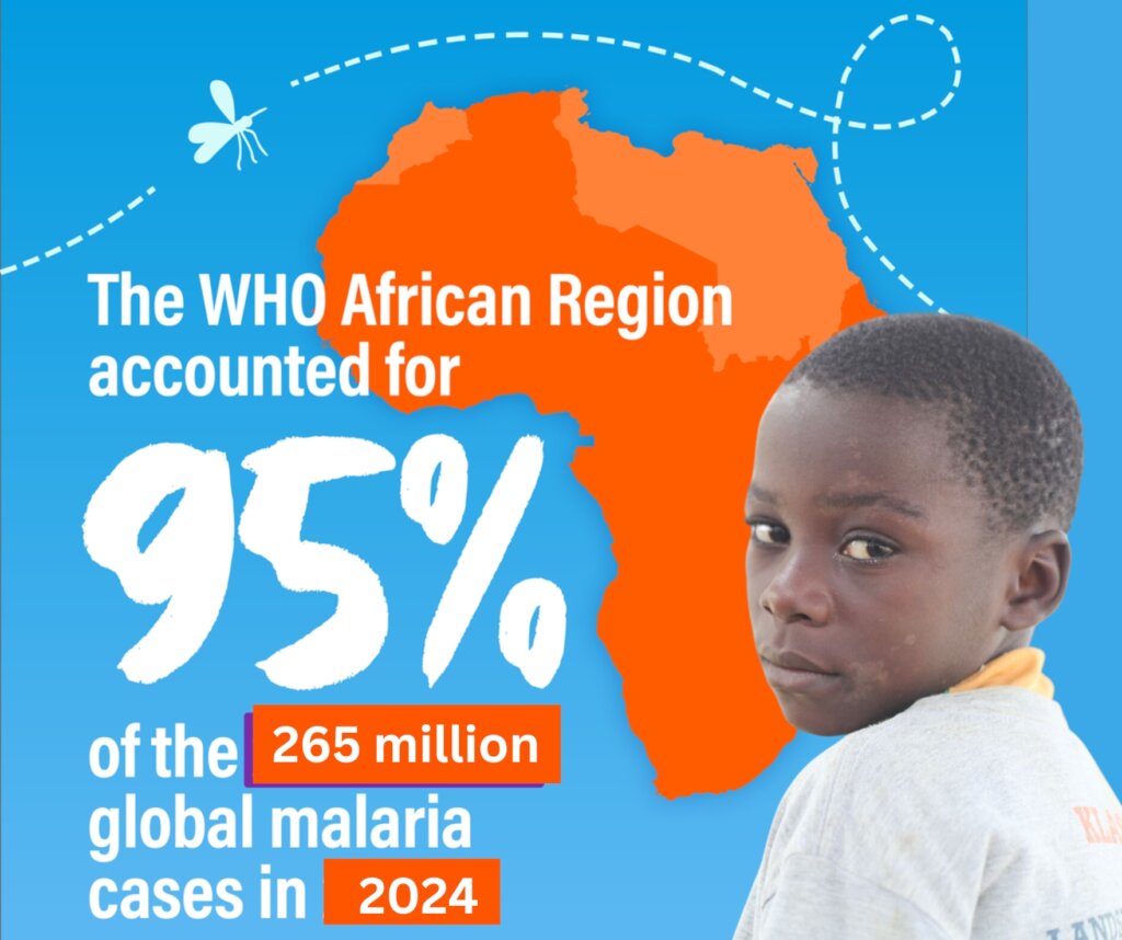 In 2024, the WHO African Region was home to 95% of malaria cases (265 million) and 95% (579 000) of malaria deaths.