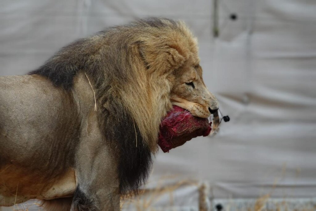 The summer rains also mean one thing in Limpopo: grass grows wildly. We have been very busy maintaining Telo’s lion enclosure so the grass does not become too high. We still want our handsome boy to see what is going on around him. In one of the photos you will see him proudly enjoying a piece of meat, completely unaware that his gardeners are working overtime for him.