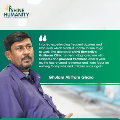Hope arrived when a relative told him about the SHINE Humanity Clinic in Sujawal. Traveling from Shah Bander, Gul Hassan arrived at the clinic seeking help for his foot, but he soon discovered that his health challenges ran deeper than an infection. Through assessment, it was discovered that Gul Hassan’s blood sugar was dangerously high at 400 mg/dl. For the first time in his life, Gul Hassan learned he was living with Diabetes Mellitus - the underlying reason why his wound refused to heal.