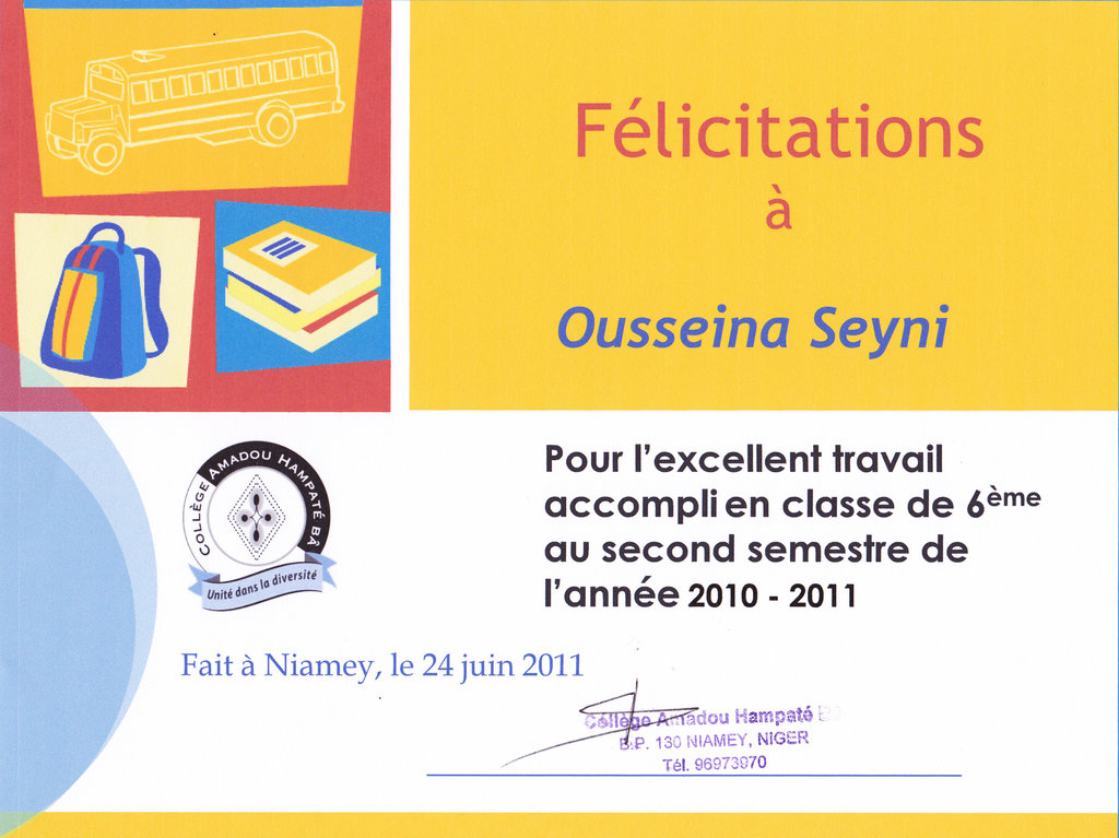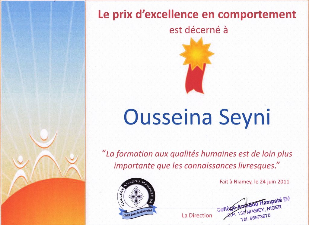 Ousseina Seyni is so happy and thankful she got a full scholarship this year to go to Hampaté Bâ Middle School with its unique quality education. This opportunity inspired her to work hard and we are proud of her results. She successfully passed her 6th grade exams and received two Merit Awards: one for her excellent grades and another for her human qualities. Ousseina’s father, a janitor, was very touched when he found out that his daughter had not only done well academically, but had also shown and given respect to fellow students and teachers throughout the school year.