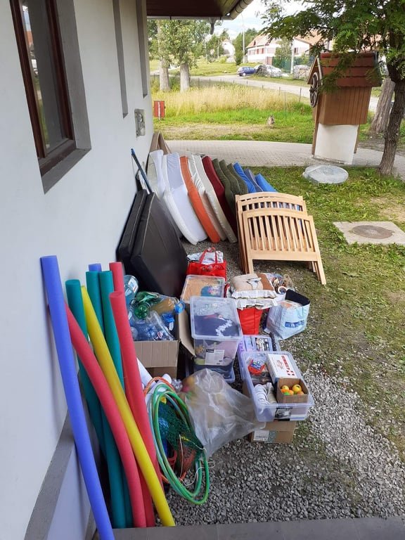 Piles of toys, pencils, paper, footballs and funny costumes are gathered from the storeroom, waiting in the office to be put into a car and taken to the new camp location.