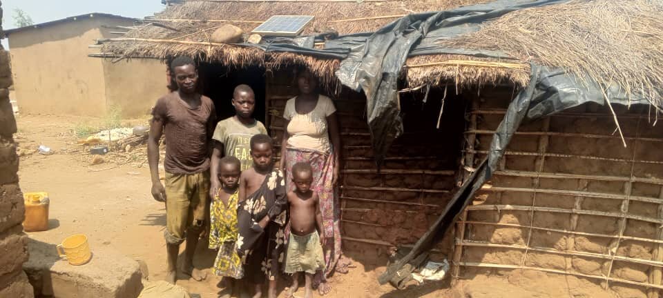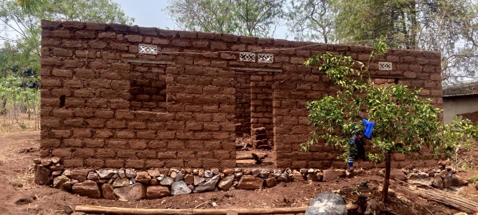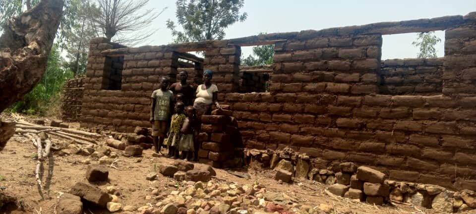 The house that we build for a family, has 45 square meters (485 square feet). This house does accommodate a family of 7 to 10 people. It has 2 doors, 4 windows, a sitting room and 2 bedrooms. We stucco/plaster the house with cement, to protect the house from rainwater. Stucco is done on the external walls of the house. They cook outside of the house in a small kitchen that they build themselves. We also help the beneficiary of the house build a toilet, outside of the house.