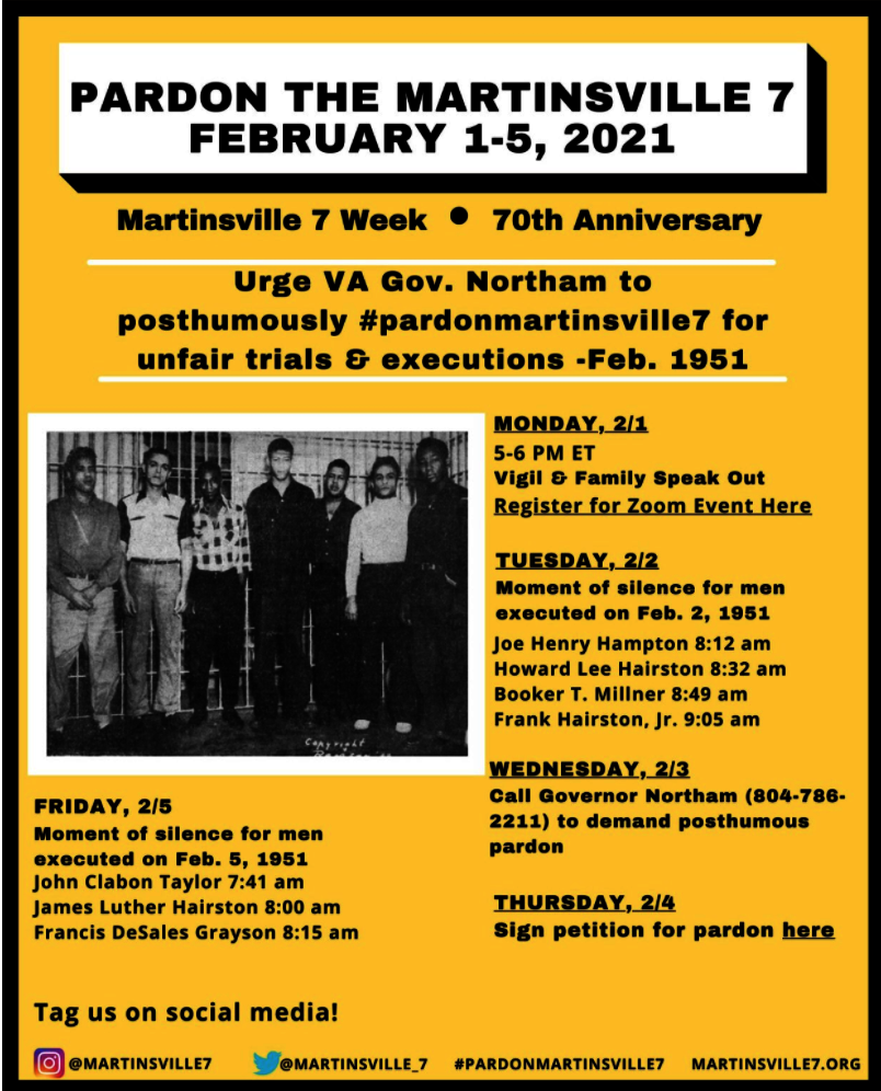 A team of Free Minds Members has been working diligently on an advocacy campaign to push the Governor of Virginia to pardon the “Martinsville 7.” Members meet monthly to discuss advocacy strategies; in the past few months, they have led a call-a-thon to the Governor’s office to make him aware of the issue, initiated a social media campaign to commemorate each of the Martinsville 7’s birthdays, and have published opinion pieces linking their personal injustices with the criminal justice system to historic injustices that occurred in Virginia in 1951. Read some of their work at the links below!