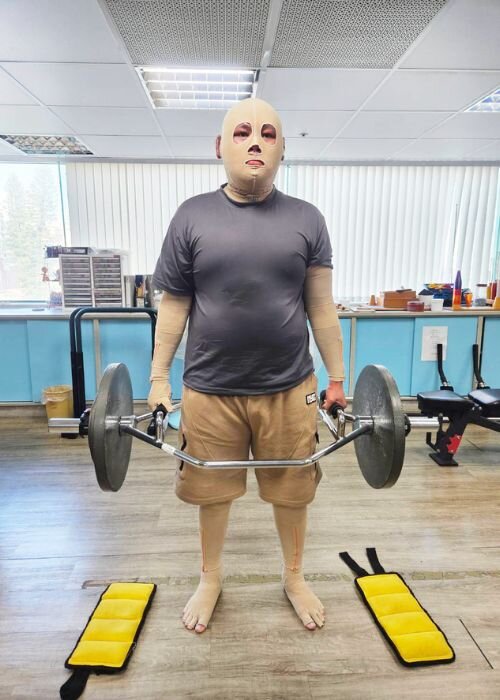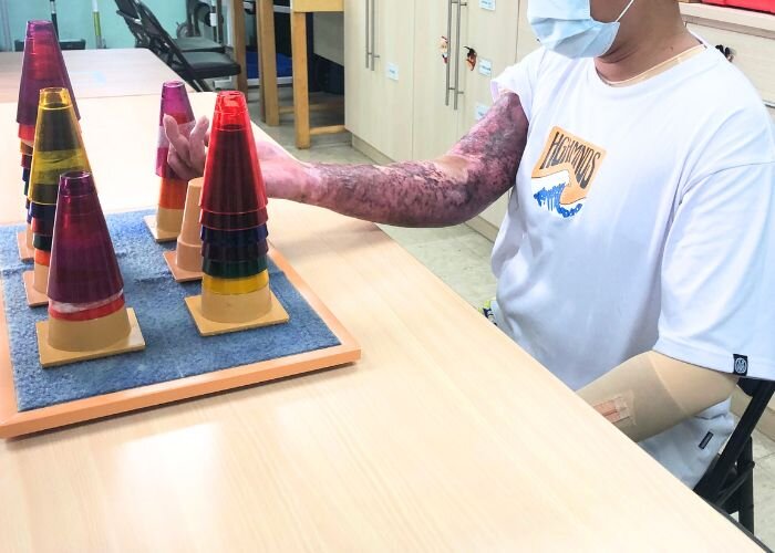 Every morning at 9:30 AM sharp, A-Cheng reports to our center. He meticulously dons his pressure garments and headgear—covering himself from head to toe despite the heat and discomfort. He pushes through muscle tremors and exhaustion, often telling his therapists, "Push me harder!"