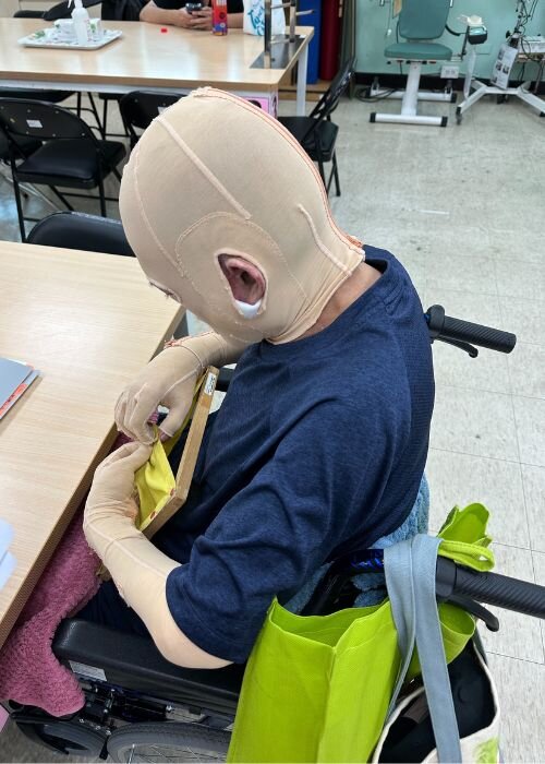 After suffering severe burns, A-Min’s skin became extremely fragile. Even simple movements like turning over in bed could cause new blisters and wounds. Despite the excruciating pain, he had to endure it to prevent his joints from contracting further. When A-Min first arrived at the Taipei Rehabilitation Center, his body was covered in wounds. He recalls, “It was very painful! Everything hurt, even getting out of bed was a struggle. I just wanted to lie still.”