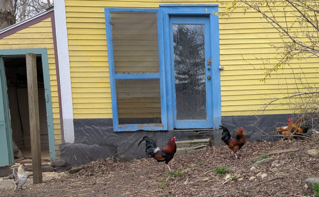 Thank you again for your support of The Rooster Project. To end on a glad note, see the snapshot below. It's not much of a phosograph in the artistic sense, but it shows the everyday amity of roosters here at the sanctuary. In it you can see four roosters who share a coop with hens and other roosters. The largest of them, Snickers, is a former fighting rooster. Thanks to donors like you, they all are enjoying a happy spring at the sanctuary!