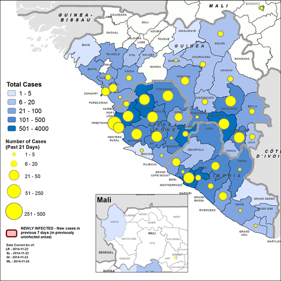 The World Health Organization’s December 10th Ebola Situation Report cites 17,942 total suspected, probable or confirmed Ebola cases and 6,388 deaths, mostly in West Africa. The case fatality rate across the three most-affected countries in patients is approximately 72%; in hospitalized patients the case fatality rate is lower, 60%.