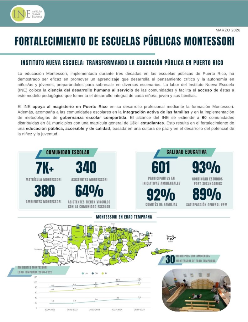 Por eso, una de las apuestas más importantes del Instituto Nueva Escuela ha sido fortalecer los ambientes Montessori para Infantes y Andarines dentro de las Escuelas Públicas Montessori a las cuales servimos.