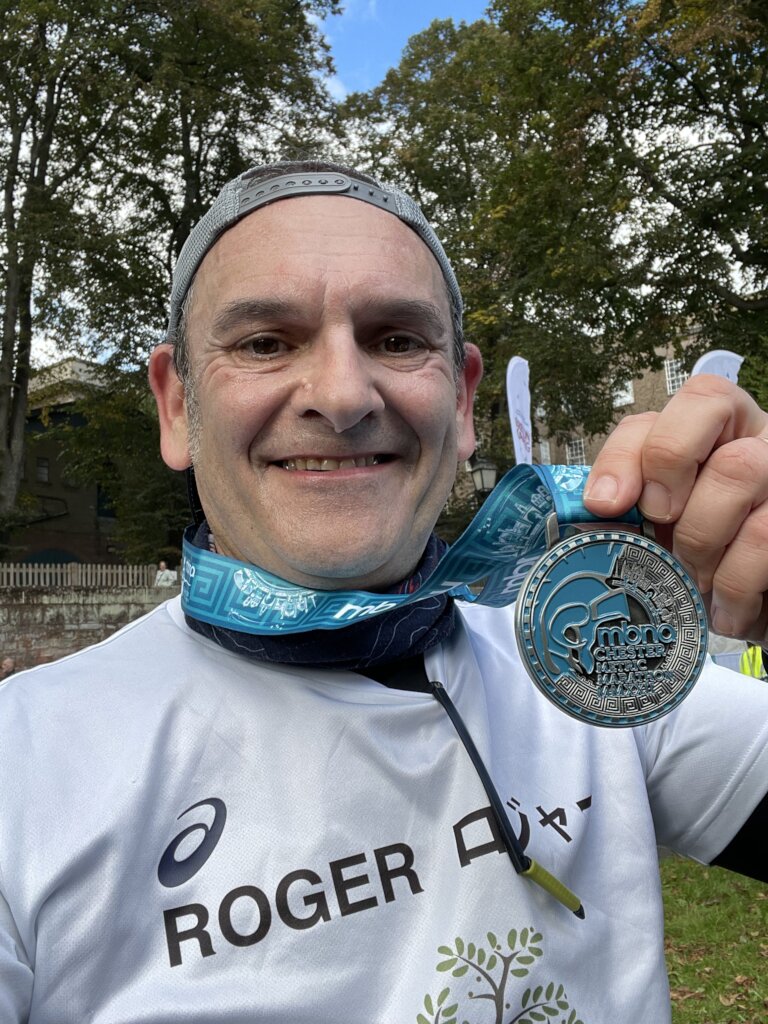 Roger spent three months training for the Chester Metric Marathon. During that time, he used a 12 week training plan where he ran three times a week including a mix of easy runs, interval training, long runs, cross training and rest days every week to build strength into other muscle sets, especially the all-important core.