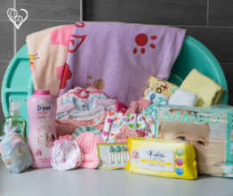 Buys a baby basket that includes: baby powder, soap, oil, clothes, bouncer, bath, blankets, towels, diapers, wet wipes, formula, maternity clothes, etc.