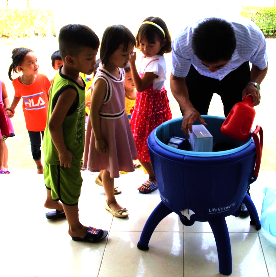 The container is a MEDRIX-provided Life Straw Safe water dispenser that will fill 500 cups - that is 500 children can quinch their thrist from this nano-filtered container. The container can be refilled, filter and dserve another 500 cups over and over again. What a gift of life and health!