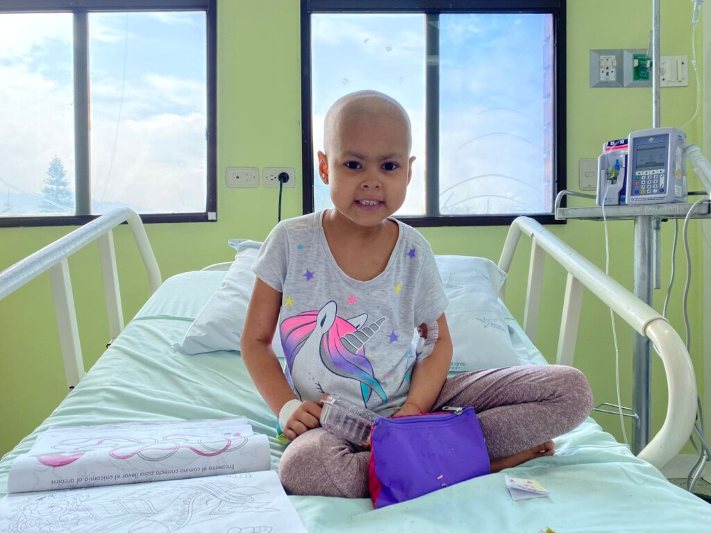 Isabela tiene 9 años y fue diagnosticada con leucemia. Presenta síntomas desde octubre de 2022, y el 27 de abril ingresó en nuestro hospital para recibir tratamiento de quimioterapia. Actualmente se encuentra en nuestra unidad de oncología.