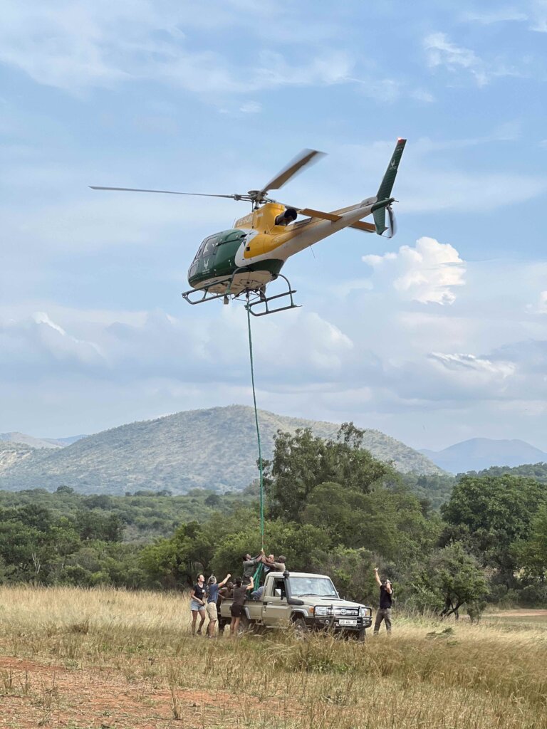 In February, two young male rhino calves were found alone in Kruger National Park, far too young to survive without their mothers. A complex rescue operation involving park teams, veterinarians, helicopter crews, and Care for Wild staff was launched immediately. Challenging terrain meant one calf, Nguni, had to be airlifted to safety, while the older calf, Wagu, was transported by ground. Despite extreme heat and incoming storms, both calves were stabilised and brought safely to Care for Wild, where they were reunited within an hour of arrival, an important moment of comfort in an unfamiliar environment.