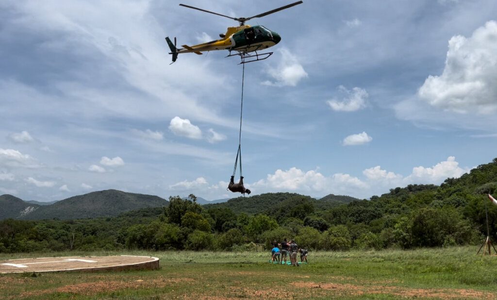On December 31st, the Care for Wild team received an emergency call from Kruger National Park about a female calf, later named Nola, who lost her mother to poachers on Christmas Day. The Kruger ground team, led by Section Ranger Greg Bond, had been searching tirelessly for days before locating her. Due to her size, Nola could not fit inside the helicopter and was instead sedated and airlifted, suspended by ropes, to Care for Wild’s Juvenile Intensive Care Unit (ICU). Upon arrival, Petronel and the team worked through the night, administering IV fluids and stabilizing her condition.