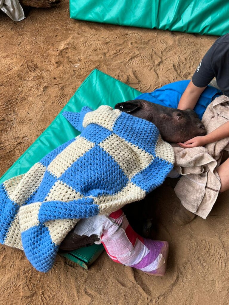 In addition to medical care, Hercules’ emotional well-being has been a priority. Stress management plays a vital role in recovery, so the team provided companionship, fresh air, and enrichment. Since his bandages prevented natural mud wallowing, the team applied protective film to his bandages and covered them with mud by hand to mimic natural behavior.
