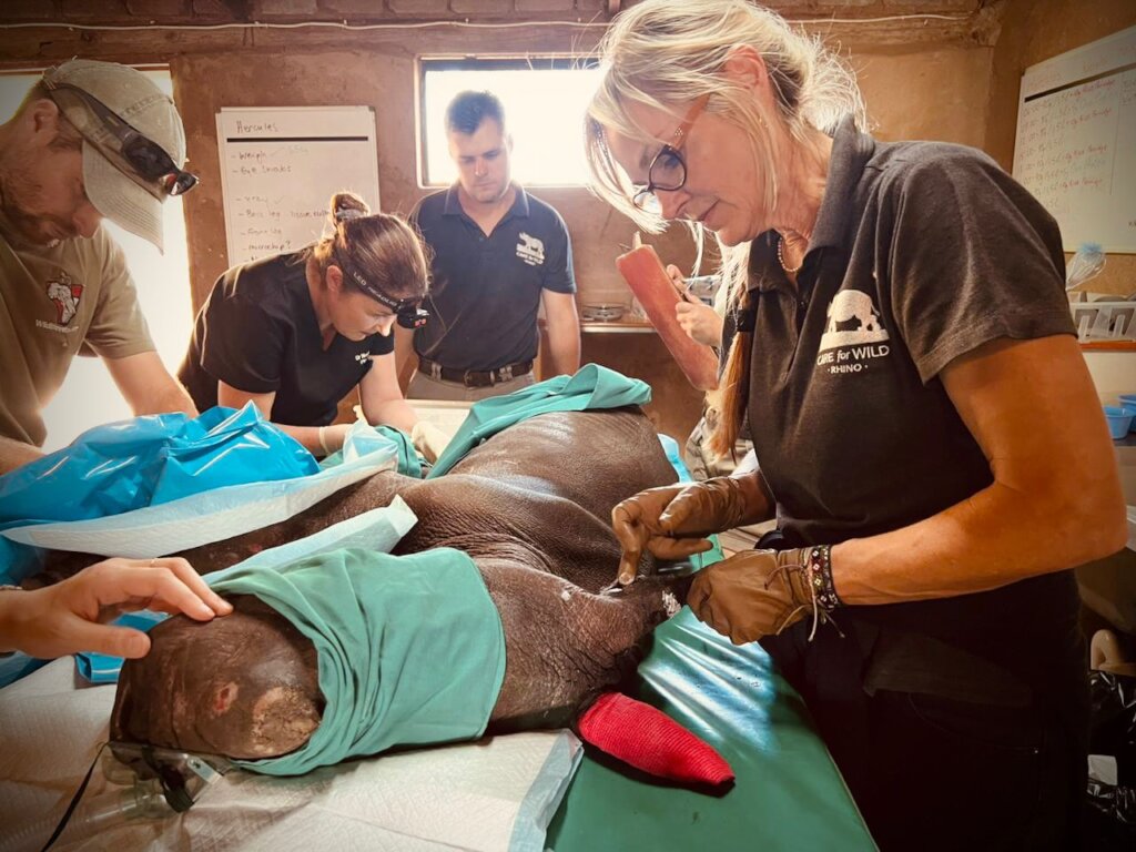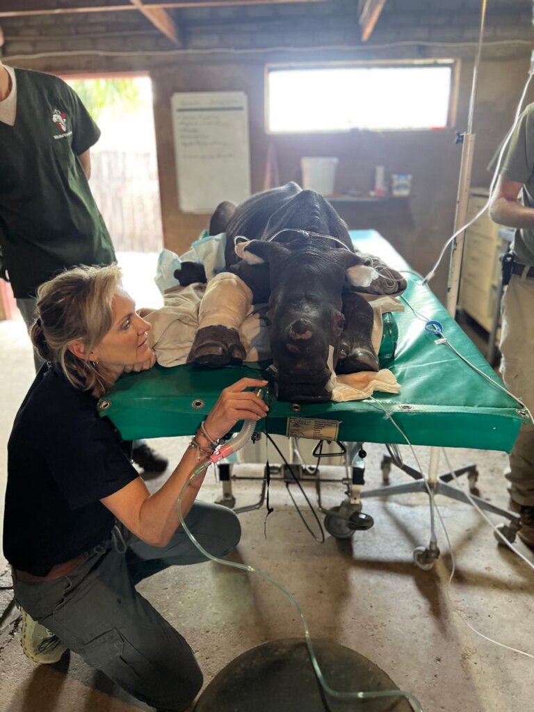 A critical moment came when Hercules’ dangerously low albumin levels necessitated an urgent plasma transfusion. Blood was collected from Hawk, a rehabilitated and rewilded rhino orphan, and processed overnight before being administered the next morning. The transfusion helped stabilize Hercules, supporting tissue repair and wound healing.