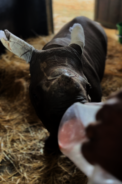 In October 2024, Hercules, a two-week-old white rhino calf, was found critically injured after surviving a brutal hyena attack. His injuries included fractures, crush injuries, and severe infections, requiring intensive care in our ICU. His treatment involved innovative veterinary interventions, such as regular blood tests, bacterial cultures, X-rays, and specialized wound management.