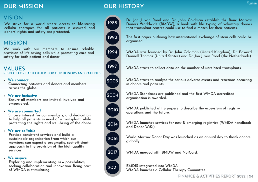 The World Marrow Donor Association (WMDA) works with its members in 55 countries to ensure reliable provision of life-saving cells whilst promoting patient and donor care and safety.