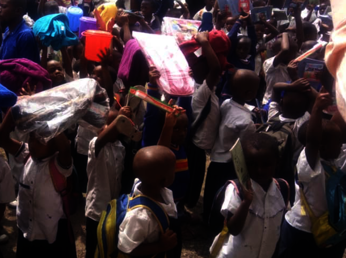 ![Bujovu school children receive bags and books]()