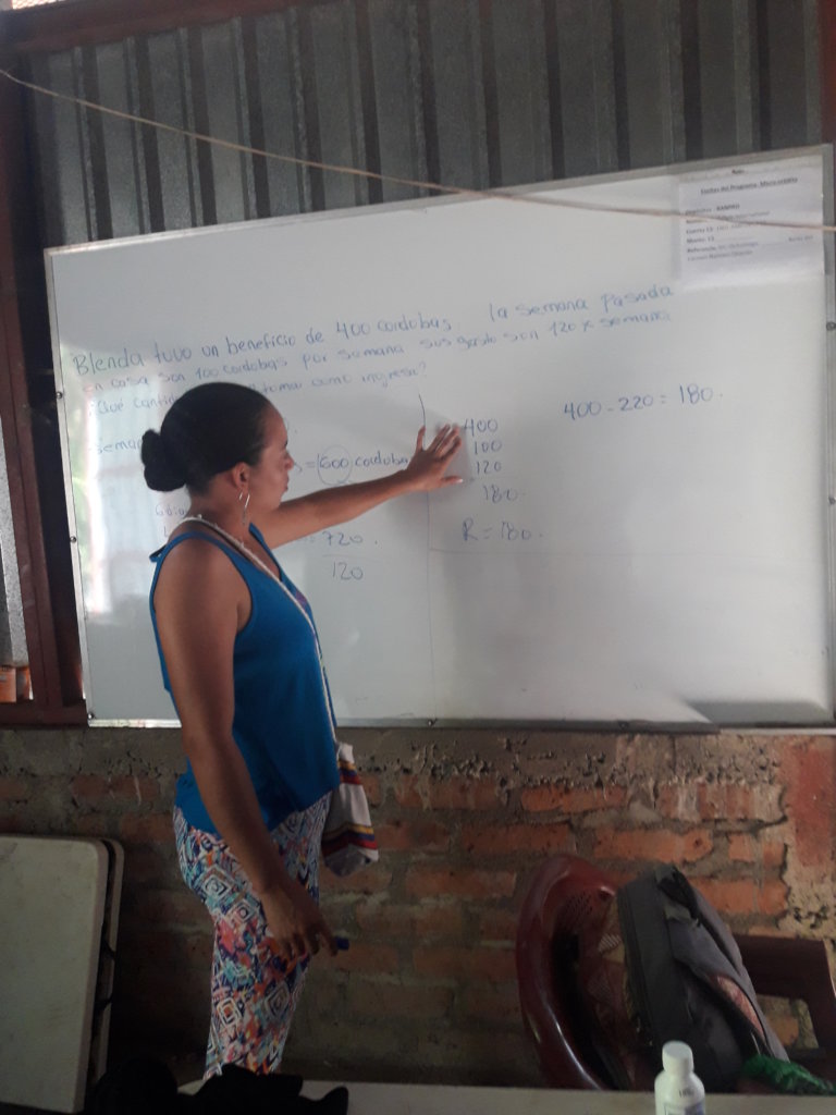 With our training program, Adriana learned to save $200 and is operating her own loan plan from her piggy bank. Whatever she takes from her savings, she puts back into her piggy bank with 10% interest. Her savings come from selling her pastries on the bus, at the health center, and at the Ministry of Education.