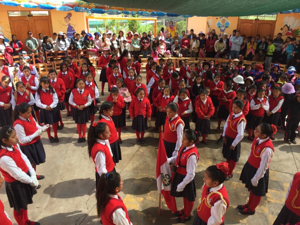 CW 2019 School year ends tomorrow for summer. The new year will start next March 2020 for schools in Peru. Party activities take the stage now along with the holiday cookie making by the Bakery school girls and our returning alumnae girls, seen with Ruth, for the party. Our Alumnae girls at the University and in Vocational College are taking their finals the last few days of this school year so will come late. The 6th grade Honor Guard passes the torch to the 5th grade for 2020 seen in photo.