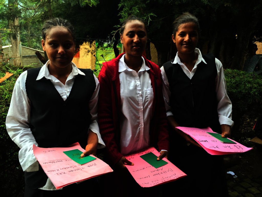 Here are the three girls in our program who just started 9th grade. They’re wearing school uniforms and carrying report cards and bank books, three things that your support provides. The school uniforms are mandatory in public schools in Ethiopia. The families of the girls in our program earn less than $2 a day and cannot afford to purchase the uniforms. This means that the kids can’t go to school. Through your support, Enhance Worldwide sends girls like these three to school by providing uniforms as well as shoes, notebooks, pens and pencils and backpacks.