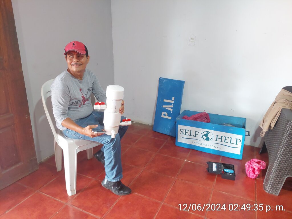 Montiel responded immediately to help El Jícaro install a chlorination system and, as of September 2024, the community enjoys having good quality drinking water. Montiel showed the CAPS directors how chlorine is applied to the water and is then distributed by pipe to the homes in the community. Currently, El Jícaro has a chlorination device made with PVC materials that is designed to capture water from two sources, one by gravity and one by using a pump. The two water sources can be chlorinated simultaneously when they enter a distribution basin, which allows the purification of approximately 18,370 liters (4,853 gallons) daily.