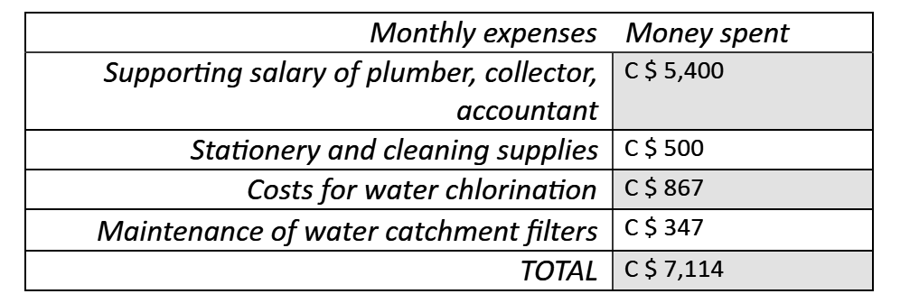 “Each month we spend between C $ 735 to C $ 1,000 in order to purchase between seven to ten chlorine tablets. This makes sure that our water stays chlorinated so that community members have safe drinking water.