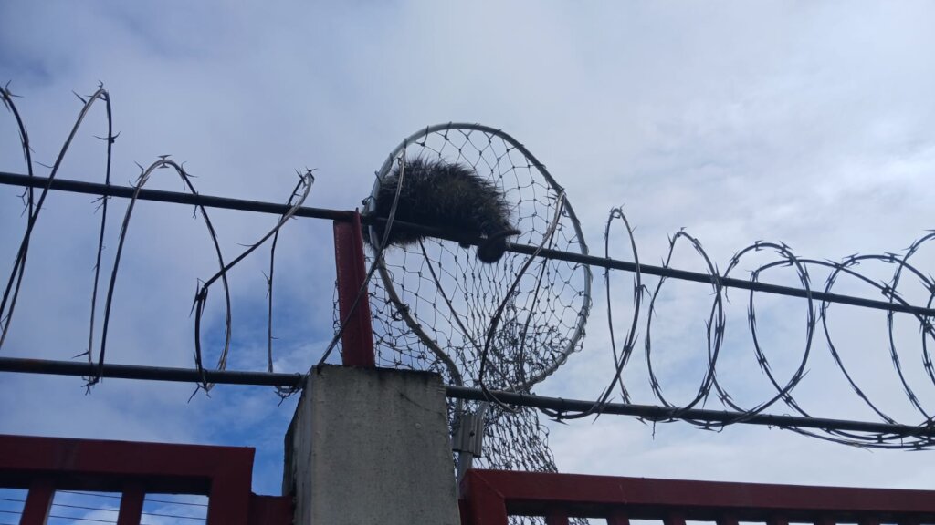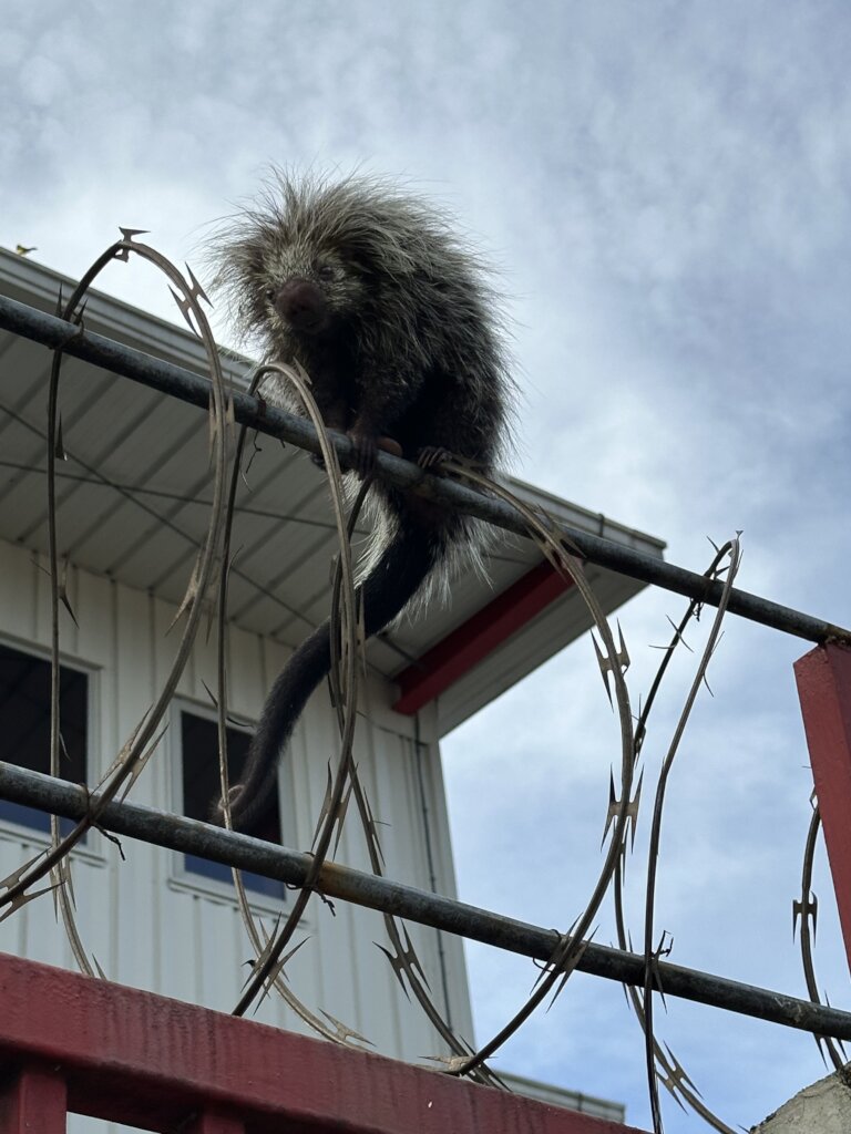 I received from the local beer brewery a call that a baby porcupine was walking on their fence. When I arrived, it was no baby—just a rare hairy porcupine, inching across coils of razor wire. Porcupines are not very fast, so as soon as the ladder arrived, I tried to get the animal in a net, but as you can imagine, my net got caught in the razor blades, and I could not easily maneuver. Porcupines have very soft hands, that they use to hold their food and to walk over the branches in the trees. My second attempt, while balancing on a ladder, and with my animal gloves on, was to lift the animal up from the fence and out of the razor wire coils. However, the animal was clutching onto the razor wire, and of course I could not pull it without risking severe cut wounds to the animal. Two staff members came to help me, and together we managed to remove the animal from the razor wire fence. Our vet treated some of the cut wounds, but as the animal was apparently not eating after two nights, we had to decide that since its wounds were not bleeding or infected, it was better to let it go and find healing leaves and nutrition all by itself in our forest.