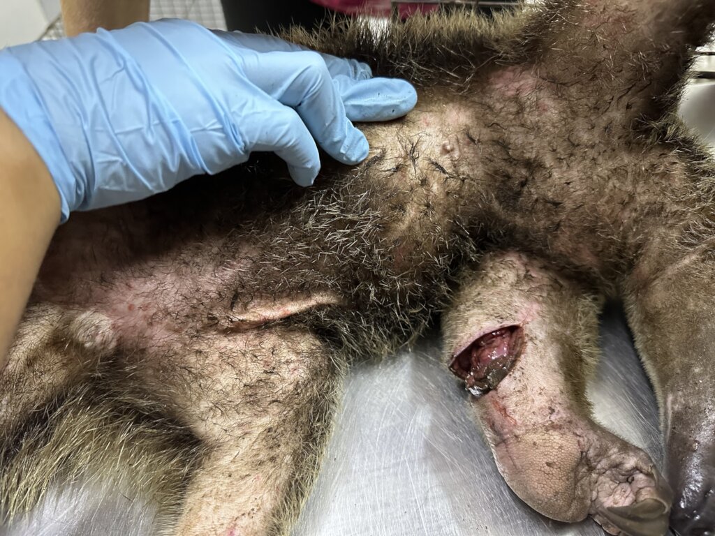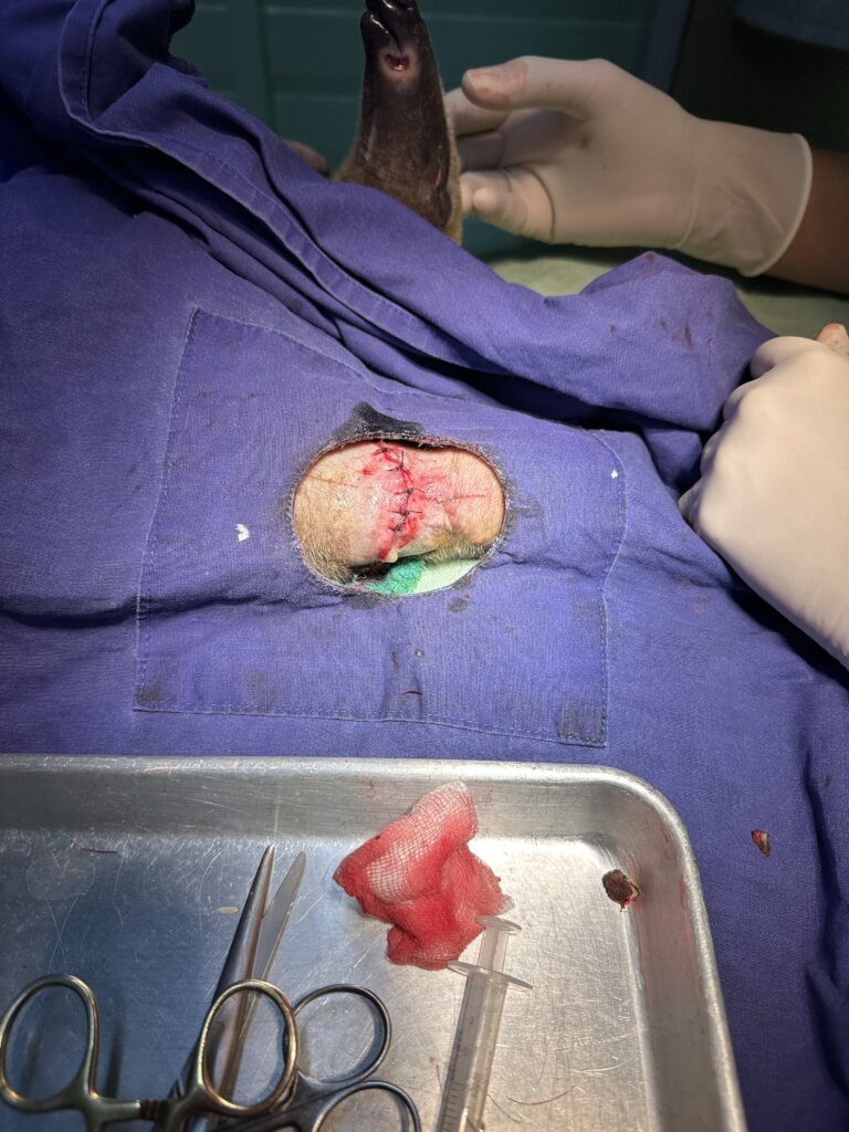 The second rescue call was from a lady who loves animals and regularly picks them up from the road when they are crossing, after which she calls us. This time it was an animal, according to her account a baby anteater, that had fought with their dog. When we arrived, we found the animal covered in a blanket. To me, it was not a good sign that the animal had been lying there, covered in a blanket, without trying to escape. The animal was very weak and we easily managed to transfer it to one of our animal carriers. We contacted the vet and we were told we could bring the animal for a health check. As she was being inspected, we realized that she probably had already been weakened by previous cut wounds. And she walked, weakened as she was, past the dog, who then attacked her. Her older cut wounds were from what we could see, most likely sustained during an encounter with razor wire. It was a deep wound in her front paw, and fortunately not through the tendon, so she could still use her powerful claws. However, the biggest claw from her other paw was gone. And for us it is a mystery, did she get stuck somewhere and lost her claw, or was this also caused by the razor wire. We had to stitch the wound, and she is currently recovering from her ordeal at our rehabilitation center. Hopefully July, as we called her, will be strong again soon so we can let her roam the forest again, far from the dangers of the city.