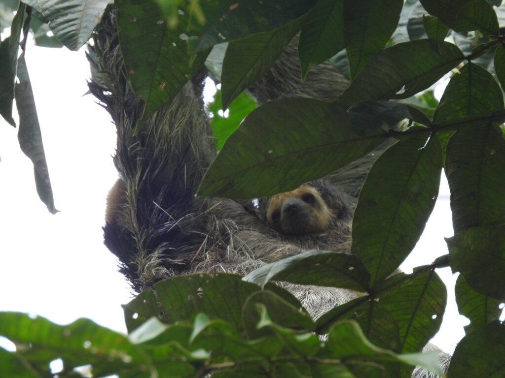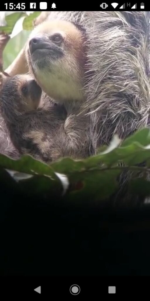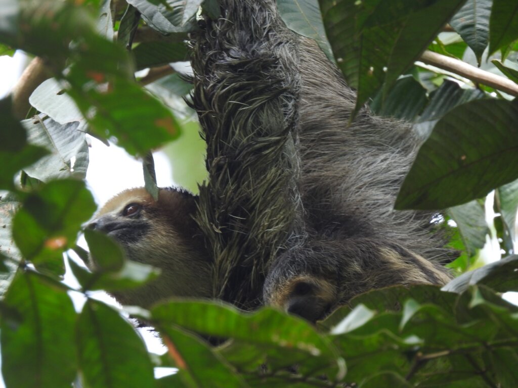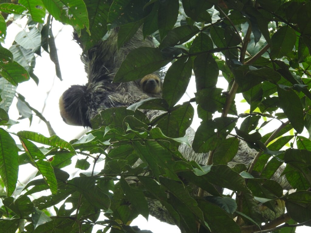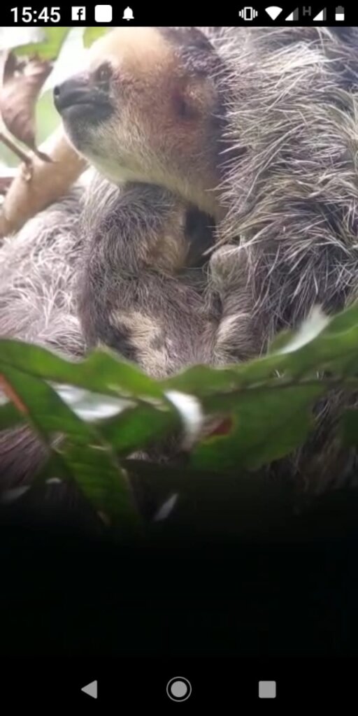And something we had never seen before happened at the end of that afternoon. We spotted an active two-fingered sloth in a tree next to our building – remember, two-fingered sloths are nocturnal! We all watched her when Sri asked me: “Does she have a baby?” And we tried to see it with a pair of binoculars, we took pictures with a zoom lens, but no… Until I looked at the photos on my computer and clearly could see a baby nose peering at us. It was the first time we had seen a two-fingered sloth at our center with a baby!