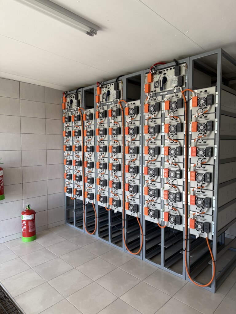 Our solar room is airconditioned to keep the temperature low. The inverters convert the electricity from the solar panels (DC) to AC electricity, which generates heat and can overheat the inverters and batteries. To prevent this, increase the lifespan, and reduce the risk of potential damage, the air conditioning keeps the room temperature consistent. It is a safety risk if the room overheats and can cause a fire hazard. A number of fire extinguishers are mounted in- and outside the room.