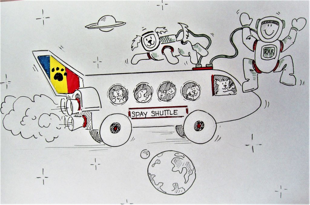 Ellen, artist extraordinaire, contributed her drawing of the Spay Shuttle. Thank you Ellen!