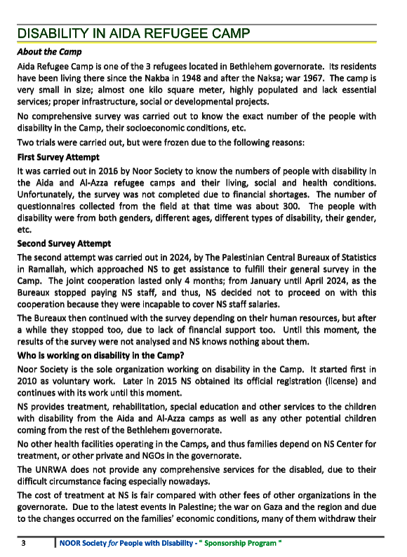 The project “Sponsorships for Children with Disabilities” (#68457) aims to provide monthly financial support to families of children with disabilities living in Palestinian refugee camps in the West Bank.