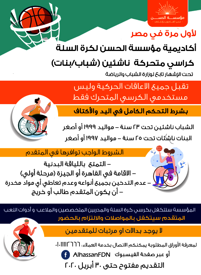 We have some very exciting news we want to share! We’re launching Alhassan Academy for Wheelchair Basketball. Our objective is to revive this competitive and amusing sport in Egypt.