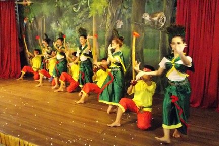 Roban Trot dancers dress in brightly colored costumes and go from house to house collecting money and offerings from the community for the local temple. Hand drums and poles with bells attached provide rhythm for the dance. The elaborate dance has several characters, including a Hunter, Oxen, Giant, and Witches who all attempt to kill the deer while Peacock tries to protect it.