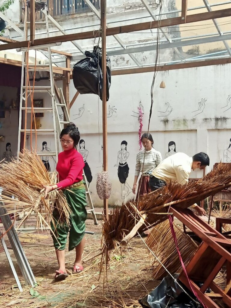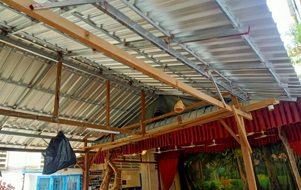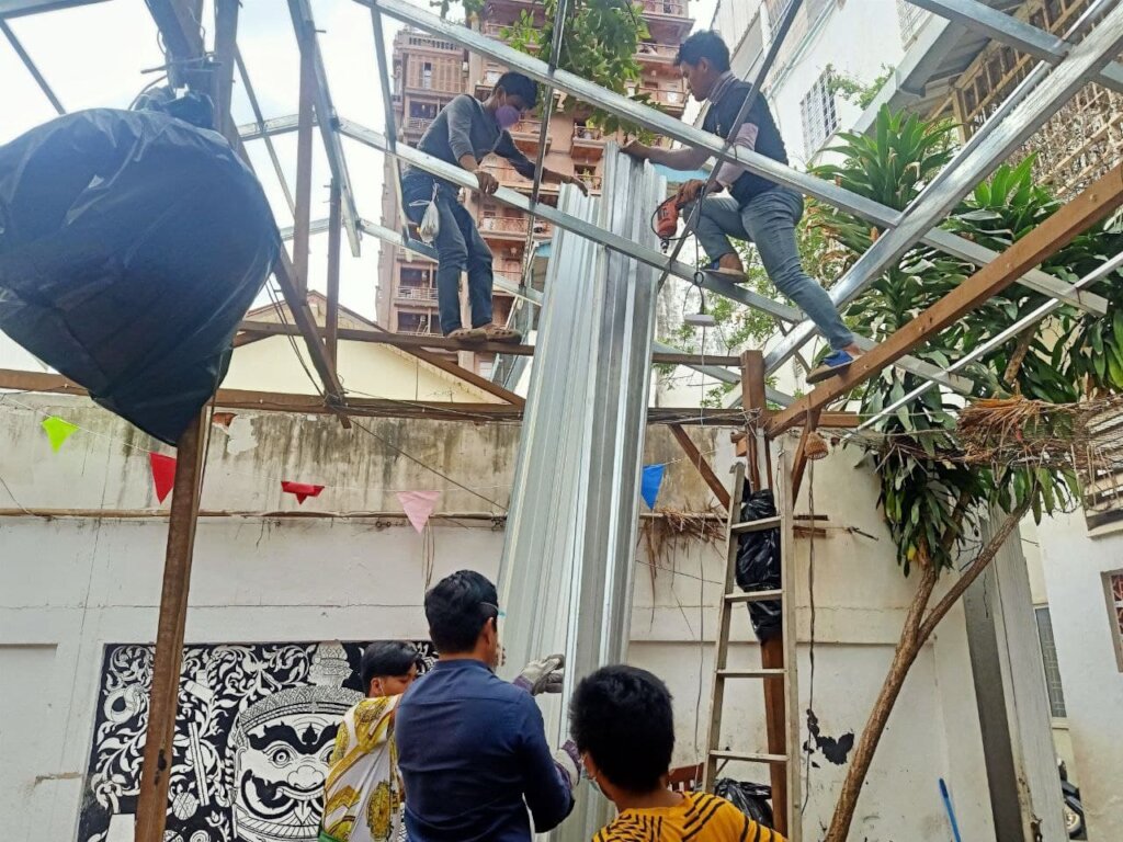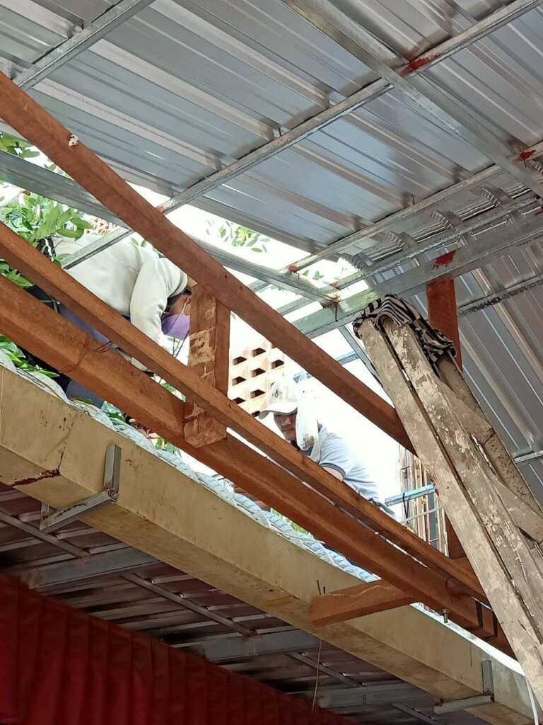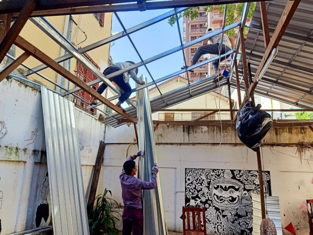 We are hopeful that things will soon return to normal in Cambodia and that the tourists will return. In the meantime, with that in mind, this month our team got to work removing the old thatched roof and replacing it with a new roof composed of steel sheets on a brand new wooden frame. Attached are photos of our teachers and students installing the roof and a photo of the new roof, completed at a cost of $ 530. The labor and clean up of the old thatch was also provided by our teachers and students.