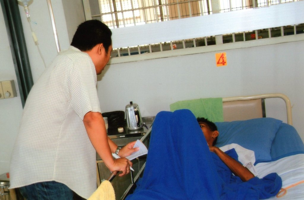 An other patient we visit regularly is Phet, this time it was with a heavy heart. We have to tell Phet that his wife died. Phet is 54 years old and doing a 25 year drug related sentence. Since he is a second time offender he will not be allegeable for amnesty soon. Phet is married with 3 adolescent children. He was in a car accident before coming to prison the second time and has been in a wheelchair ever since. His overall health is good but his emotional health is not. He is very down, angry at himself for having done drugs a second time and feeling guilty for that he can't be there for his sick wife. In the hospital he is very helpful to his peers, has learned to get around in the wheelchair easily and does errands for the bed-ridden.