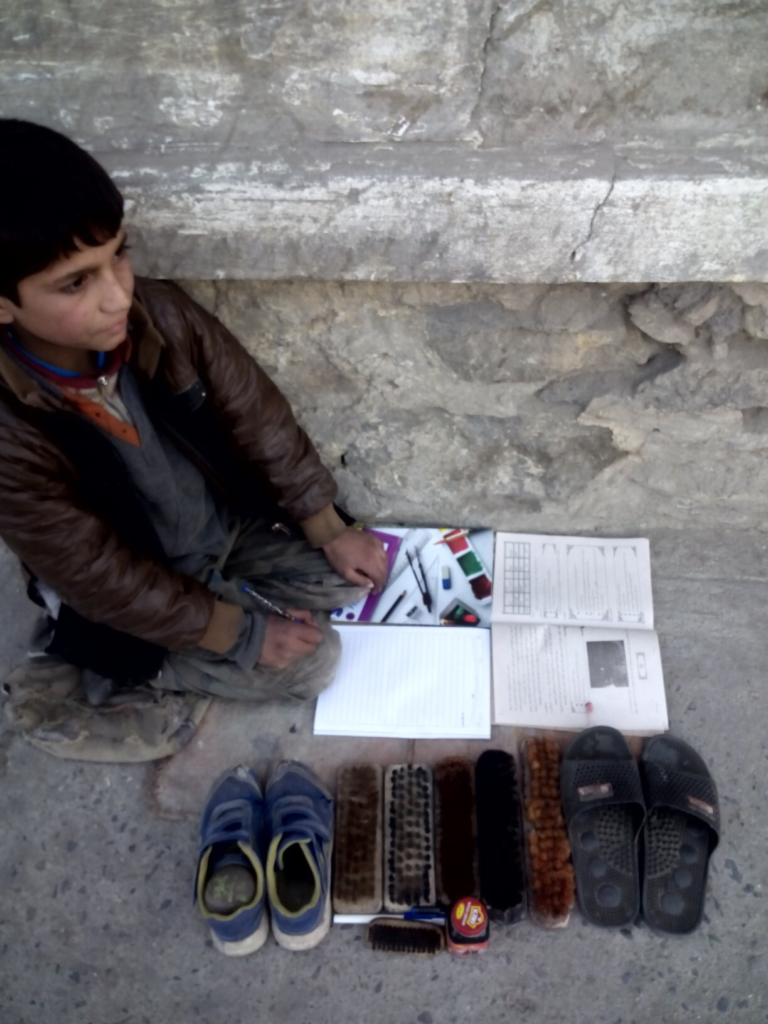 Since Ismail's father was not able to find a job in Kabul, he grabbed different gigs on the street. Ismail, as an only son, also felt a need to help his family. He has been working as a shoe shining boy on the Kabul's streets. His daily income ranges between 70 to 100 Afghanis ($1 to $1.40), with which he can buy some bread on the way back home.