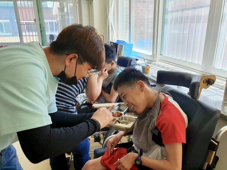 Minyeal volunteers on a regular basis at Aemangwon, one of the children’s homes we support with KKOOM outreach. With his strong connections to the staff, he coordinated a visit for KKOOM’s Chief Administrator and seven volunteers in August 2019. The volunteers included other young adults from Samsungwon, Fulbright Korea English Teachers, and former KKOOM volunteers. We stayed at Aemangwon about two hours and played with the children in two different rooms, ages ranging from nine years old to twenty-four years old. Minyeal helped feed lunch to the teens / young adults in their 20s who are unable to walk.