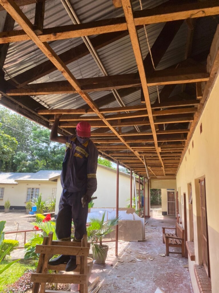 Troubles with the building began a few months ago with heavy rains that continued for several months. The ceilings in the long porch that connects all the classroom and therapy rooms began to leak because seeping water from above had rotted the ceiling material. Classes have continued in the areas where it is relatively dry, so we have begun renovation. Then, when the ceilings were removed it was discovered that the timber above them was also rotting because the actual roof was also compromised. New plans were needed and more materials.