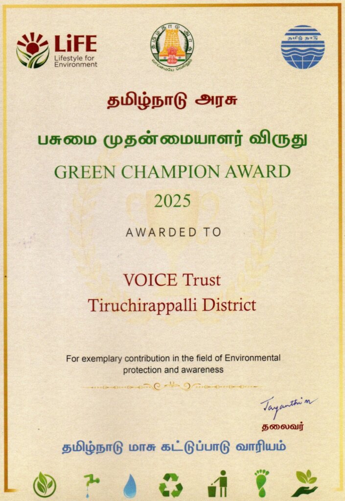 Greetings to everyone. Happy to share VOICE Trust has received the "Green Champion Award 2025" and we celebrated "World Forest Day" with 200 Children of Government Higher Secondary School, Siruganur village, Tiruchirappalli, State of Tamil Nadu, India.