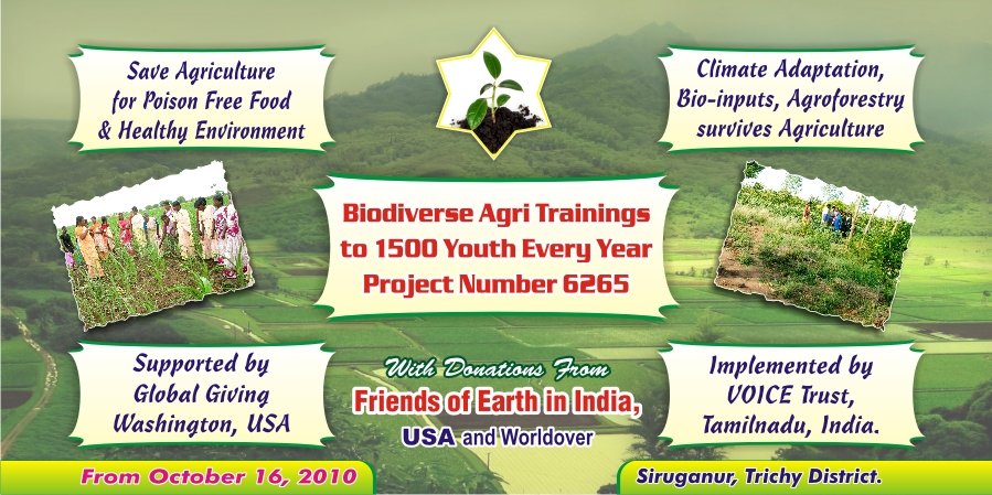 - Biodiverse Agri. trainings to Youth are important, because, many young people do not know what to do after studies and crowd the job markets. Not only jobs are not available to many, but also those who get jobs are unable to cope up with administrative demands. Agriculture is a vast area which can provide employments to many and also ii is culturally acceptable intervention for many. Hence, VOICE Trust approached Global Giving for supports. In September 2010 Open Challenge, VOICE Trust’s Project for Bio-diverse Agri. Trainings to 1500 Youth every year has been supported by 69 donors. Global Giving and VOICE Trust will continue to get more supports.
